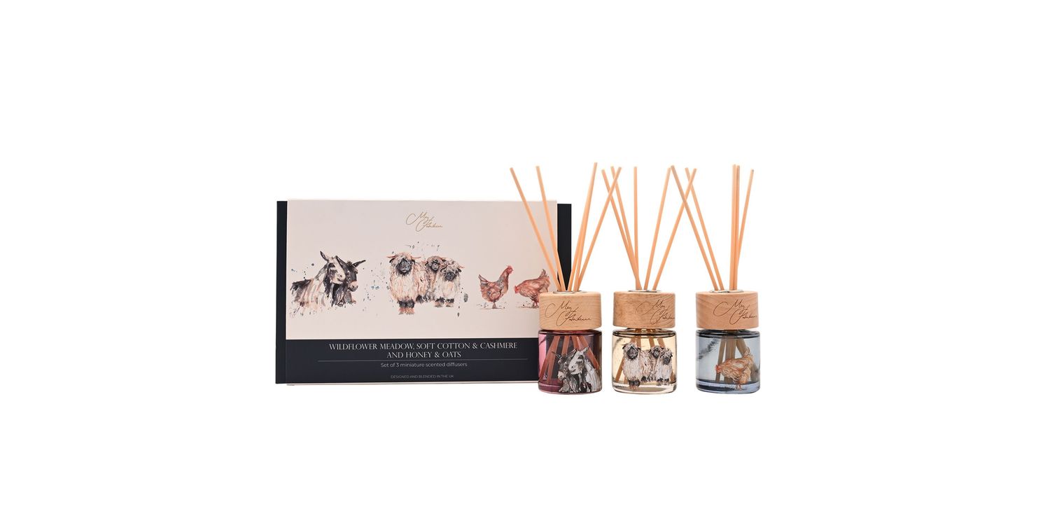 The Meg Hawkins Mini Diffusers Set of 3 – The Farm adds gentle fragrance and rustic charm to any room. Each compact diffuser features Meg’s signature watercolour farm animal illustrations and releases a soft, lasting scent, creating a welcoming ambience that’s perfect for everyday enjoyment or thoughtful gifting.