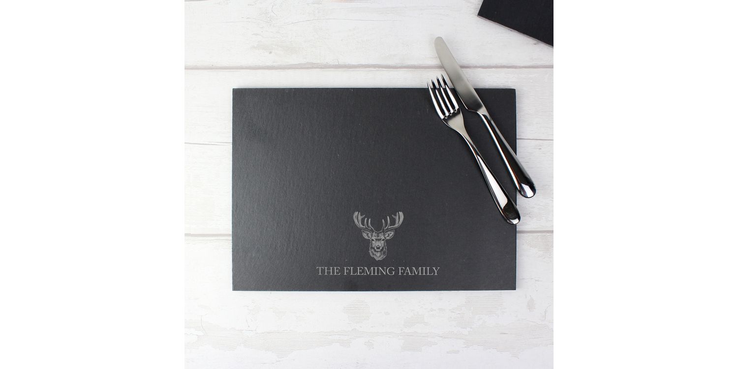 Crafted from natural slate, each placemat is unique and features a striking stag silhouette. Personalise with a line of text to create a truly special piece. Perfect for everyday use or special occasions.
