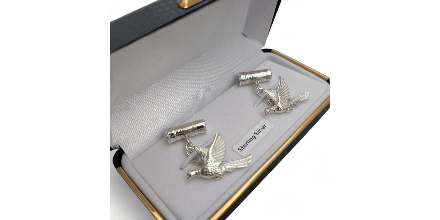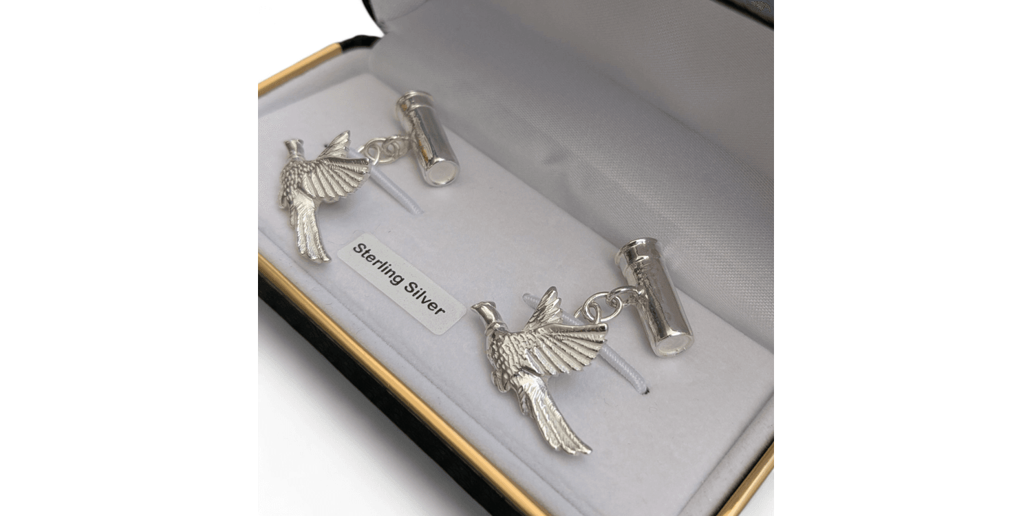 Add a refined touch to any outfit with this beautifully crafted set of Sterling Silver Cartridge and Pheasant Cufflinks.