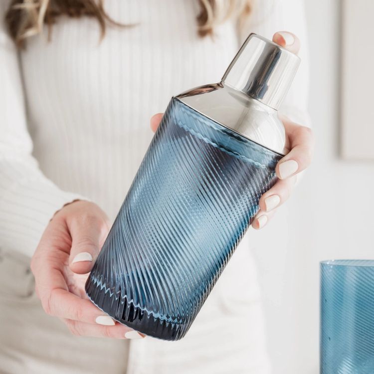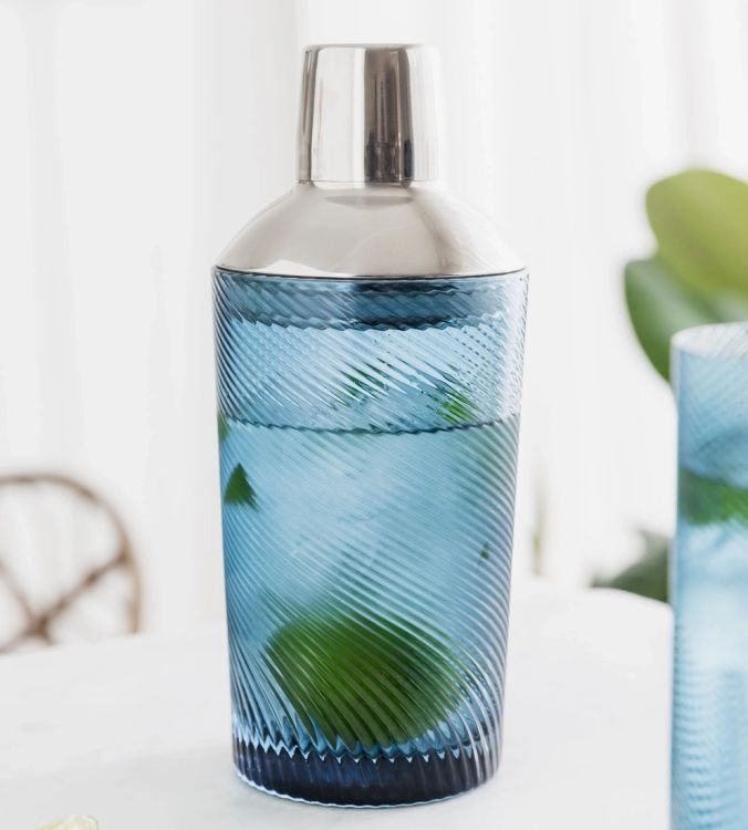 Shake up your home bar with this blue twist glass cocktail shaker, designed to bring vintage charm and modern style together. With its swirling textured finish and rich blue tint, it’s a standout piece that looks just as good on display as it does in use.