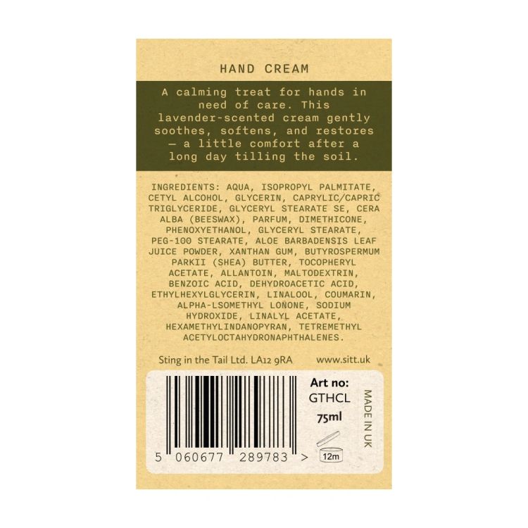A calming Gardeners Lavender Hand Cream by Sting in the Tail, made in the United Kingdom and created to soothe and protect hands after time spent outdoors. The blend includes shea butter, aloe vera and beeswax, absorbing smoothly and leaving a gentle lavender scent.