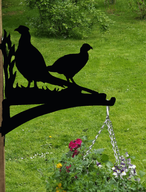 A male and female pheasant gaze off into the distance in this charming Hanging Basket Bracket.
