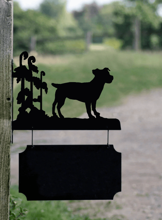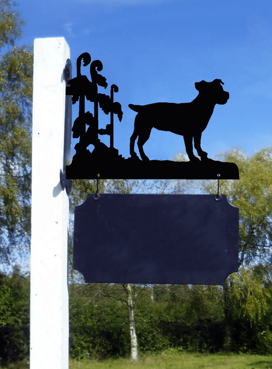 The size of the hanging plate adjusts to accommodate your desired lettering. For instance, signs with a house name and your Jack Russell's name will have a deeper plate to ensure balanced aesthetics.