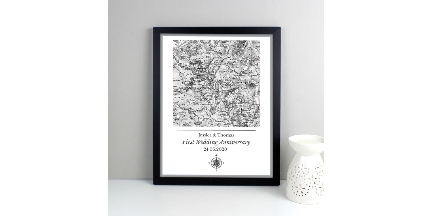 Personalised with an old series map centered around a Full UK Postcode (see exclusions below), and a further 3 lines of up to 25 characters per line. Please note line 2 will appear larger than lines 1 and 3. All personalisation will appear as requested. To finish this stylish piece of art, each piece is mounted and framed in a large black frame. The frame will display the local area surrounding your chosen postcode. All maps are digital reproductions of original Ordnance Survey maps.