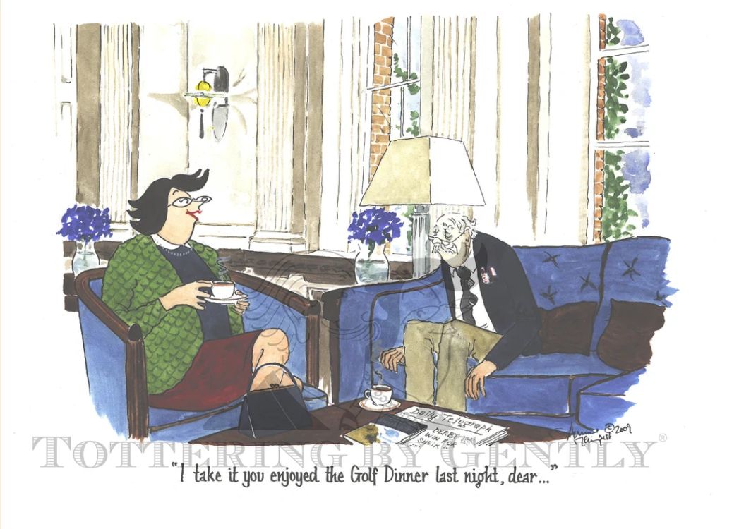 Tottering by Gently – Good Evening at Golf Club Print by Annie Tempest captures the wit and charm of country life with her much-loved characters, Daffy and Dicky. This humorous giclée print celebrates the social side of the golf club, making it a wonderful piece for collectors and fans of British satire.