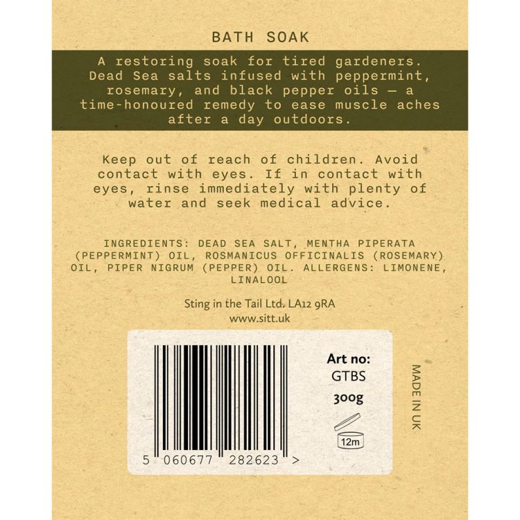 Natural bath salts handmade in England by Sting in the Tail, created for gardeners who enjoy a simple moment of calm after time spent outdoors. These salts blend Dead Sea salt with peppermint, rosemary and black pepper essential oils, giving a clean, refreshing scent that feels uplifting after a day in the garden. They dissolve gently in warm water, offering around six relaxing baths.