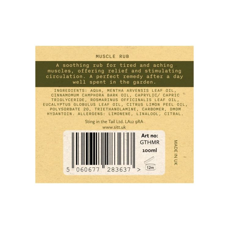 A soothing muscle rub by Sting in the Tail, made in the United Kingdom and created to bring gentle relief to tired, overworked muscles. The blend includes cooling menthol, rosemary, eucalyptus and lemon oils, helping to ease tension and stimulate circulation. It absorbs smoothly into the skin and is a simple remedy after a day spent gardening, walking or working outdoors.