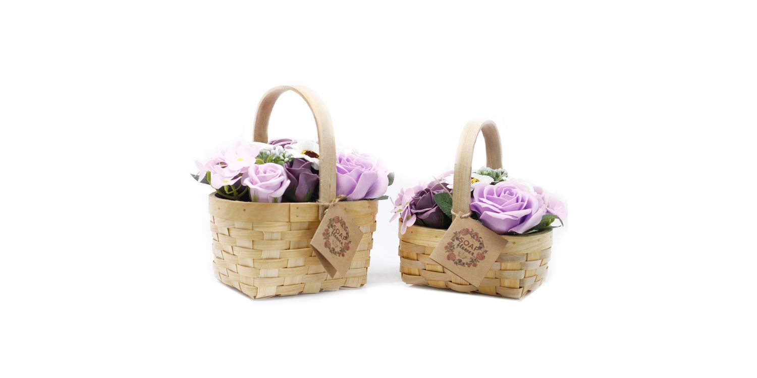 Indulge your senses with the calming charm of this Medium Lilac Soap Flower Bouquet, beautifully arranged in a rustic wicker basket. These delicately crafted flowers look almost real and dissolve in warm water, releasing a gentle fragrance and transforming your bath into a soothing, spa-like experience.