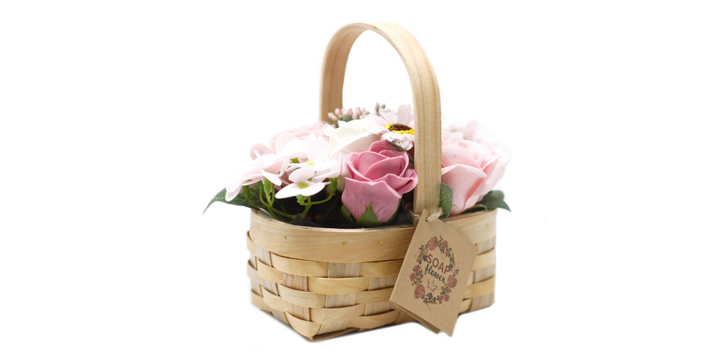 Delight in the soft elegance of the Medium Pink Soap Flower Bouquet, a beautiful blend of form and function. Artistically arranged in a charming wicker basket, these lifelike soap flowers are a lovely decorative touch and a treat for the senses. Drop one or two into your bath and enjoy a moment of calm with scented water and silky-soft skin.