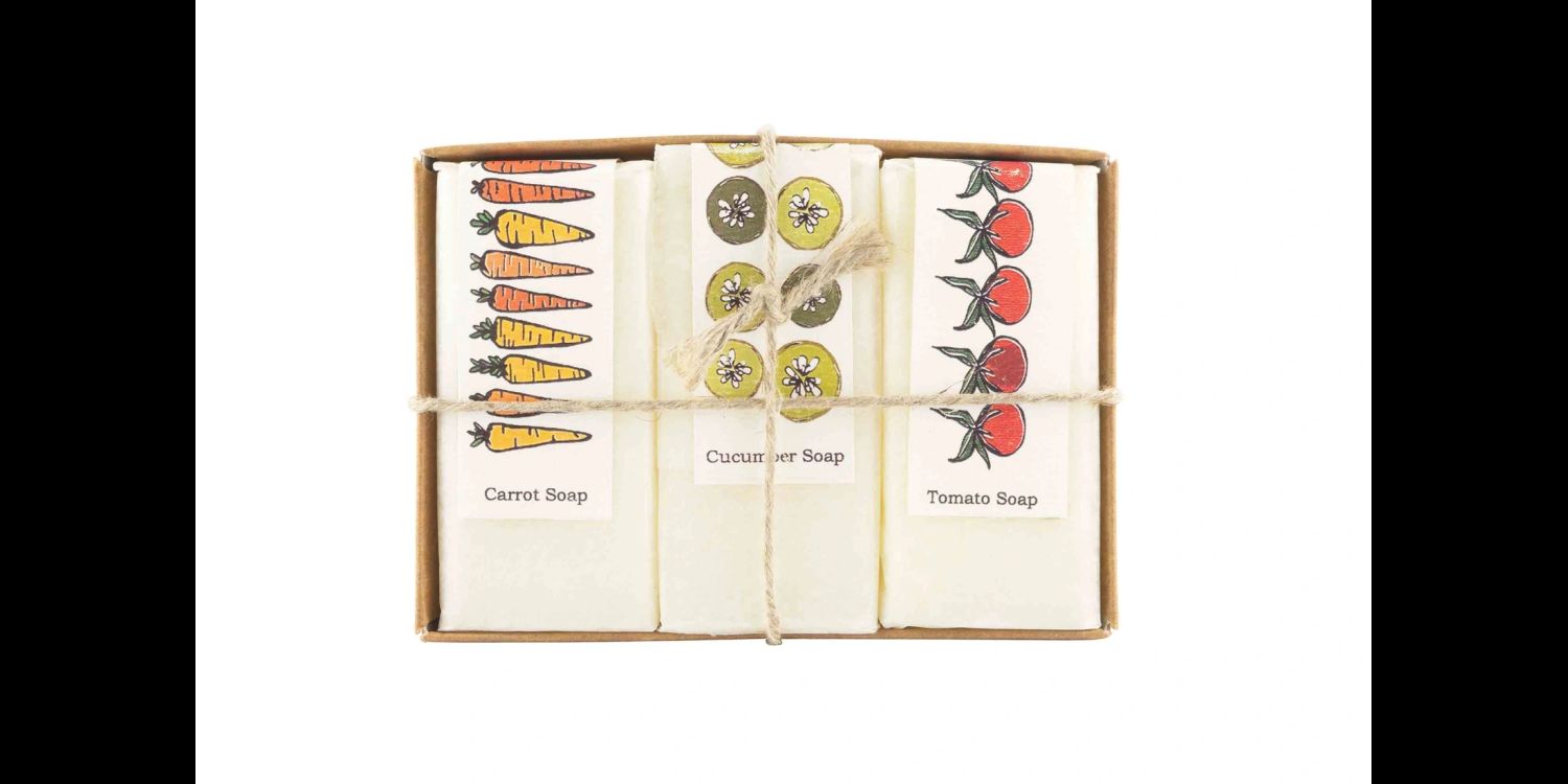 • Set includes 3 x 80g soaps: Carrot, Cucumber and Tomato Leaf