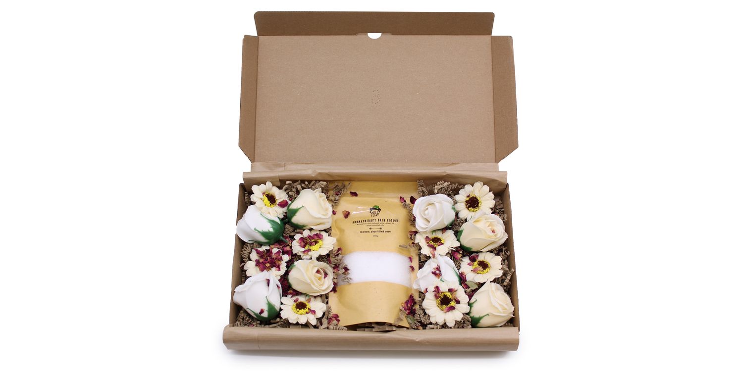 • Soap Flowers: 8 Soap Roses and 8 Soap Sunflowers that beautifully dissolve in warm water, adding a touch of elegance and soothing aromatics to your bath.