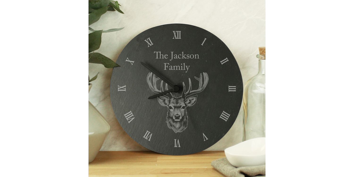 Crafted from unique, hand-cut slate, this clock showcases the beauty of nature while offering precise timekeeping. Personalise it with two lines of text for a truly bespoke piece. The majestic stag design adds a touch of woodland charm to any space.