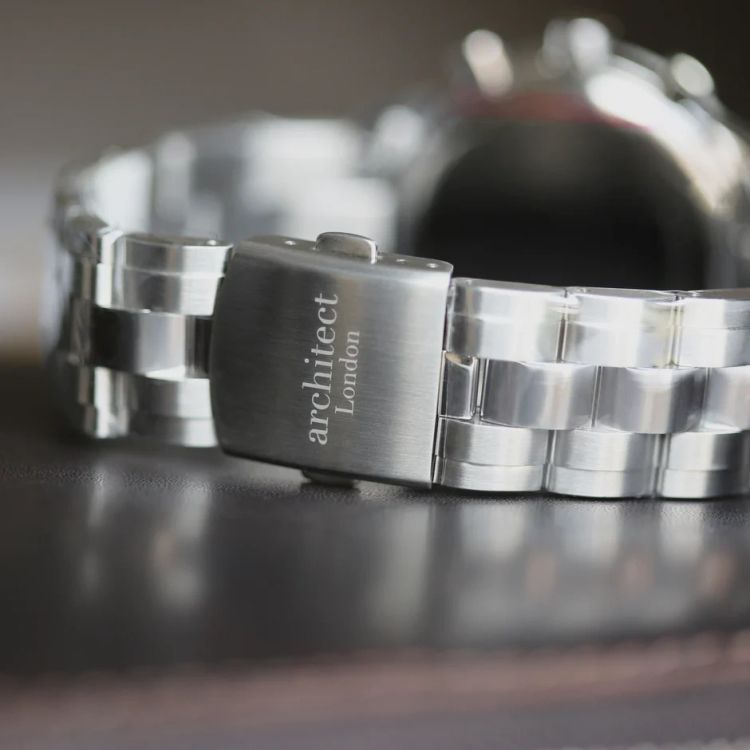 Precision meets personalisation with the Architect Endeavour – a handcrafted Swiss-made chronograph built for those who value detail and distinction. Engineered from high-grade stainless steel and sapphire-coated glass, it delivers reliability and refinement in every second. Its clean case back provides space for your engraved message in a modern font, creating a gift that lasts a lifetime.