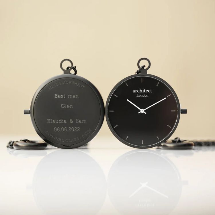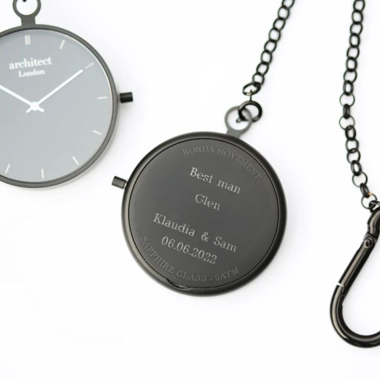 Sleek, contemporary and built to last, the Modern Pocket Watch in brushed black finish redefines a true classic. Combining cutting-edge design with traditional craftsmanship, it features a premium Swiss Ronda movement, sapphire glass and a durable stainless-steel case for precision and longevity. A refined accessory for modern gentlemen and timeless moments alike.